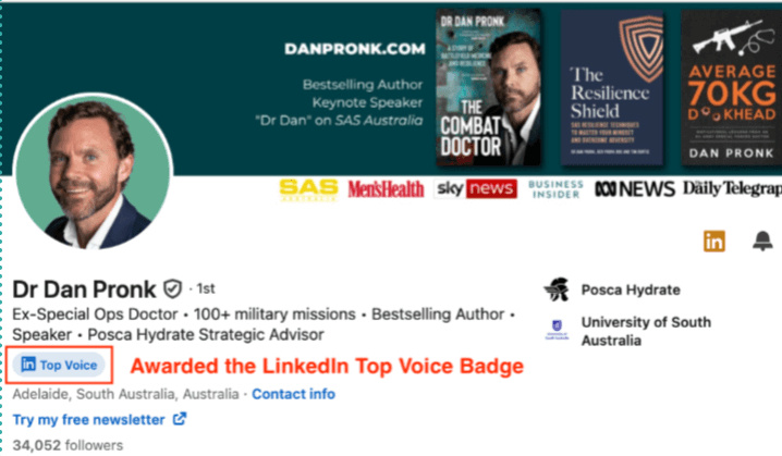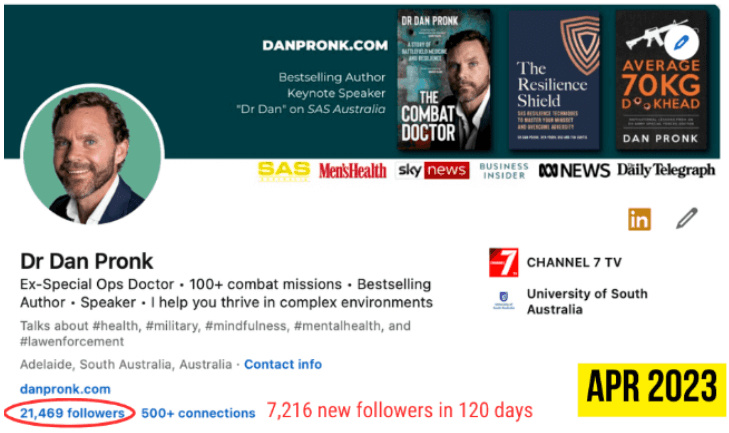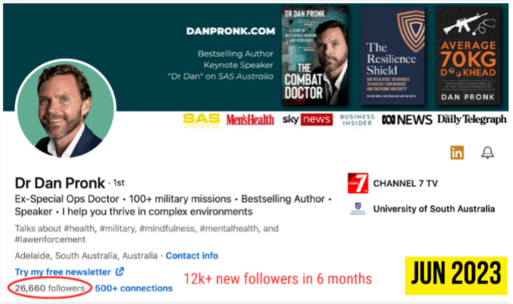 I worked with Steve to grow my audience and get more speaking engagements.In 120 days, I got: 2.6M+ LinkedIn views, 7,600+ new LinkedIn followers, 2,400+ new newsletter subscribers, and multiple inbound opportunities. I more than tripled my investment.Dr Dan Pronk, Ex-Special Ops Doctor, Bestselling Author and TV personality